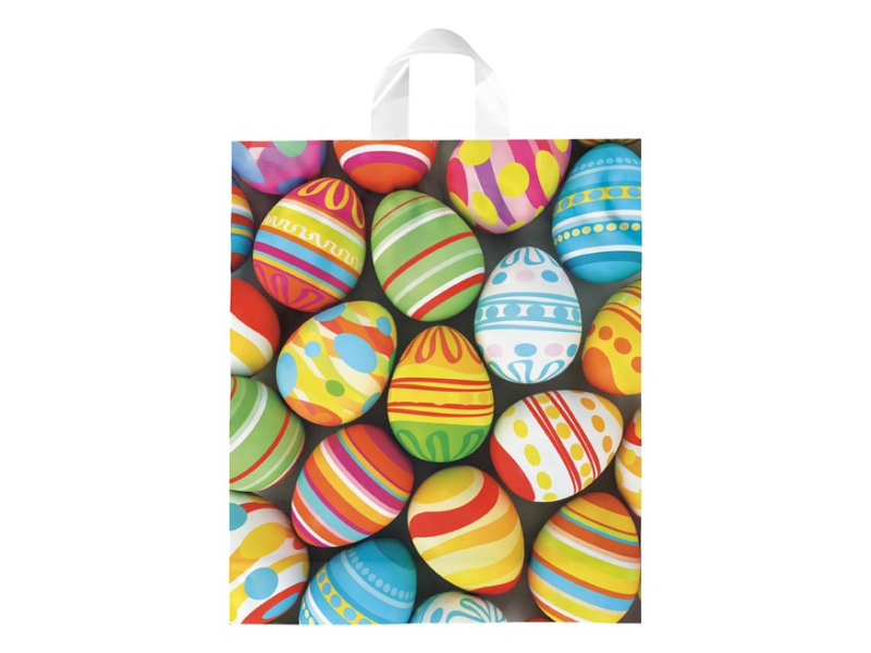 Celoplošne potlačená igelitová taška s motívom veľkonočných vajíčok a s privareným uchom. Sila igelitky: 0,050 mm