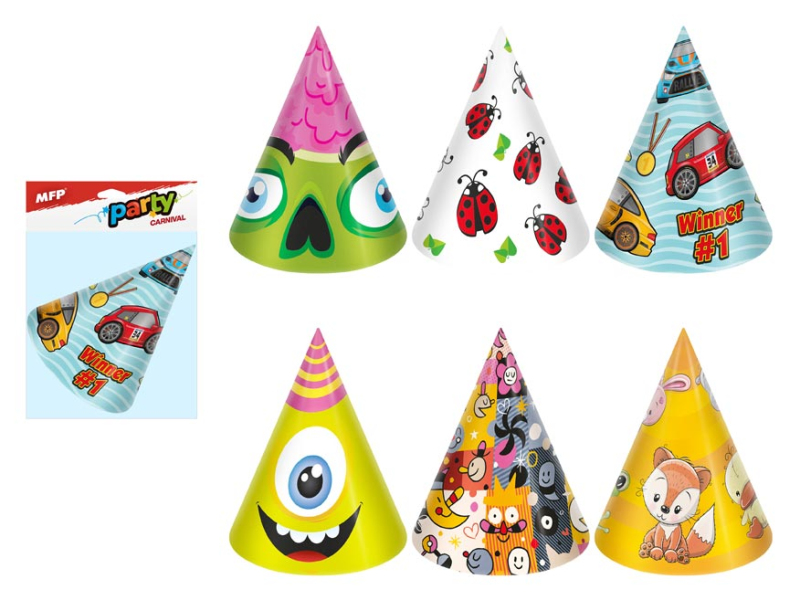 Narodeninový papierový párty klobúčik. Karnevalový klobúčik veľmi dobre drží na hlave vďaka klobúkovej gumičke, ktorá sa dáva pod bradu. Urobte radosť oslávencovi a usporiadajte veľkú párty. Nezabudnite si kúpiť aj trúbky a trumpety. BALENIE OBSAHUJE: - 6 ks farebných klobúčikov s rôznymi motívmi Dĺžka gumičky: 306 mm Výška klobúčikov: 160mcm Obvod klobúčika: 320 mm VAROVANIE: Nevhodné pre deti do 3 rokov. Nebezpečenstvo vdýchnutia a prehltnutia malých častí. Balené vo vrecku so závesom. Uvedená cena je za 1 balenie po 6 ks.