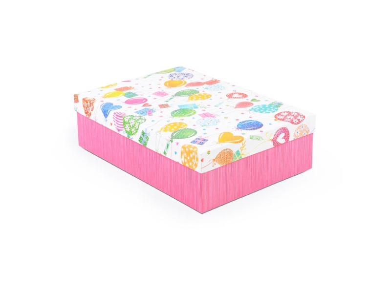 Celoročná darčeková krabica s rozmermi 35 x 25 x 10 cm Darčeková krabica v živých veselých farbách, kde základom je sýto ružová spodná časť a farebne zdobené veko s motívmi balónikov, darčekov, srdiečok a ďalších slávnostných symbolov. Je ideálny pre oslavy ako narodeniny, detské párty, sviatky alebo akúkoľvek inú príležitosť. Vďaka pevnému materiálu a atraktívnemu dizajnu môže krabica slúžiť nielen ako obal na darček, ale aj ako praktický úložný box na neskoršie použitie, napríklad na hračky, doplnky alebo pamätné predmety. Pri vložení jednej krabičky do košíka sa automaticky pridá celá sada, ktorá zahŕňa krabičky rovnakého dizajnu, ale rôznych veľkostí. Táto variabilita zaručuje, že budete mať krabičky vhodné na rôzne príležitosti a typy darčekov. Materiál: 1,5 mm kartón, potiahnutý papierom s potlačou Set obsahuje tieto krabice: 5371204 Krabica darčeková D-L007-A 14,5x10x5 cm 5371205 Krabica darčeková D-L007-B 17x12x5, 5 cm 5371206 Krabica darčeková D-L007-C 19x13,5x6 cm 5371207 Krabica darčeková D-L007-D 22x16x6, 5cm 5371208 Krabica darčeková D-L007-E 24,5x17,5x7 cm 5371209 Krabica darčeková D-L007-F 27,5x19,5x7,5 cm 5371210 Krabica darčeková D-L007-G 29x21x8 cm 5371211 Krabica darčeková D-L007-H 33x23,5x9 cm 5371212 Krabica darčeková D-L007-I 35x25x10 cm 5371213 Krabica darčeková D-L007-J 37x27x11 cm Uvedená cena je za 1 ks.