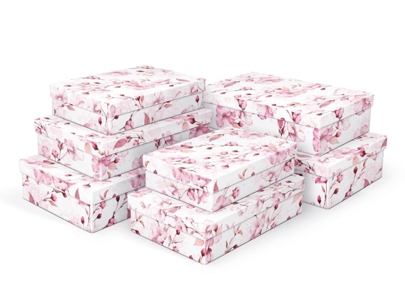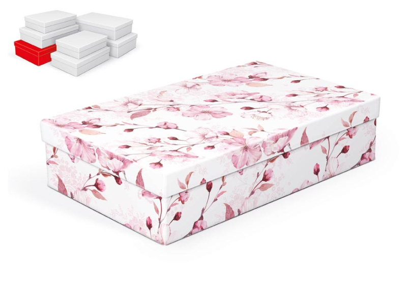 Celoročná darčeková krabička s rozmermi 34 x 22 x 8 cm Darčeková krabica s dizajnom čerešňových kvetov. Vhodná na slávnostné príležitosti, na zabalenie darčekov na oslavy, svadby alebo len tak, na uschovanie rôznych drobností. Dodávame iba v sete 7 darčekových krabičiek, ktoré sú v rovnakom dizajne, ale v rôznych veľkostiach. Pri vložení do košíka sa automaticky vložia aj ostatné krabičky, tak aby ste mali v košíku vždy celý, kompletný set. Uvedená cena je za 1 ks. Materiál: 1,5 mm kartón, potiahnutý luxusným papierom Súprava obsahuje tieto krabice: 5371061 Darčeková krabica A-C007-A 24x16x6 cm 5371062 Darčeková krabica A-C007-B 26x17x6 cm 5371063 Darčeková krabica A-C007-C 28x18x7 cm 5371064 Darčeková krabica A-C007-D 30x19x7 cm 5371065 Darčeková krabica A-C007-E 32x20x8 cm 5371066 Darčeková krabica A-C007-F 34x22x8 cm 5371067 Darčeková krabica A-C007-G 36x22x9 cm
