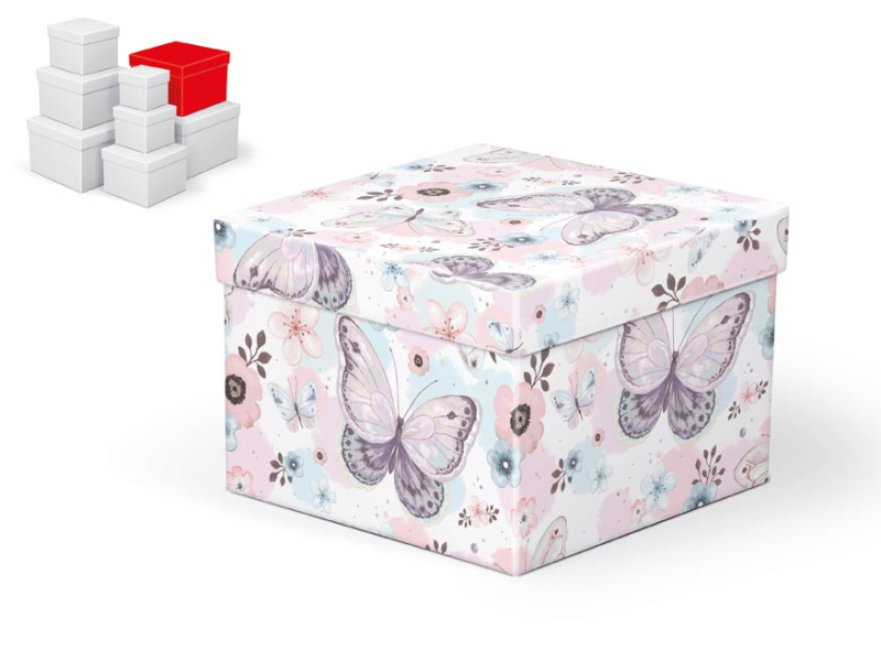 Celoročná darčeková krabička s rozmermi 18 x 18 x 13 cm Darčeková krabička s motívom motýľov a kvetov. Vhodná na slávnostné príležitosti, na balenie darčekov na oslavy alebo len na uloženie rôznych drobností.Dodávame len sadu 8 darčekových krabičiek, ktoré majú rovnaký dizajn, ale rôzne veľkosti. Pri vložení do košíka sa automaticky vložia aj ostatné krabičky, tak aby ste mali v košíku vždy celý, kompletný set. Uvedená cena je za 1 ks. Materiál: 1,5 mm kartón, potiahnutý papierom s potlačou Súprava obsahuje tieto krabice: 5371091 Darčeková krabica C-C008-A 8x8x8 cm 5371092 Darčeková krabica C-C008-B 10x10x9 cm 5371093 Darčeková krabica C-C008-C 12x12x10 cm 5371094 Darčeková krabica C-C008-D 14x14x11 cm 5371095 Darčeková krabica C-C008-E 16x16x12 cm 5371096 Darčeková krabica C-C008-F 18x18x13 cm 5371097 Darčeková krabica C-C008-G 20x20x1 4 cm 5371098 Darčeková krabica C-C008-H 22x22x15 cm