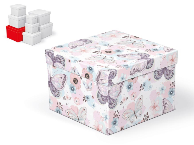 Celoročná darčeková krabička s rozmermi 20 x 20 x 14 cm Darčeková krabička s motívom motýľov a kvetov. Vhodná na slávnostné príležitosti, na balenie darčekov na oslavy alebo len na uloženie rôznych drobností. dodávame len sadu 8 darčekových krabičiek, ktoré sú v rovnakom dizajne, ale v rôznych veľkostiach.Pri vložení do košíka sa automaticky vložia aj ostatné krabičky, tak aby ste mali v košíku vždy celý, kompletný set. Uvedená cena je za 1 ks. Materiál: 1,5 mm kartón, potiahnutý papierom s potlačou Súprava obsahuje tieto krabice: 5371091 Darčeková krabica C-C008-A 8x8x8 cm 5371092 Darčeková krabica C-C008-B 10x10x9 cm 5371093 Darčeková krabica C-C008-C 12x12x10 cm 5371094 Darčeková krabica C-C008-D 14x14x11 cm 5371095 Darčeková krabica C-C008-E 16x16x12 cm 5371096 Darčeková krabica C-C008-F 18x18x13 cm 5371097 Darčeková krabica C-C008-G 20x20x1 4 cm 5371098 Darčeková krabica C-C008-H 22x22x15 cm
