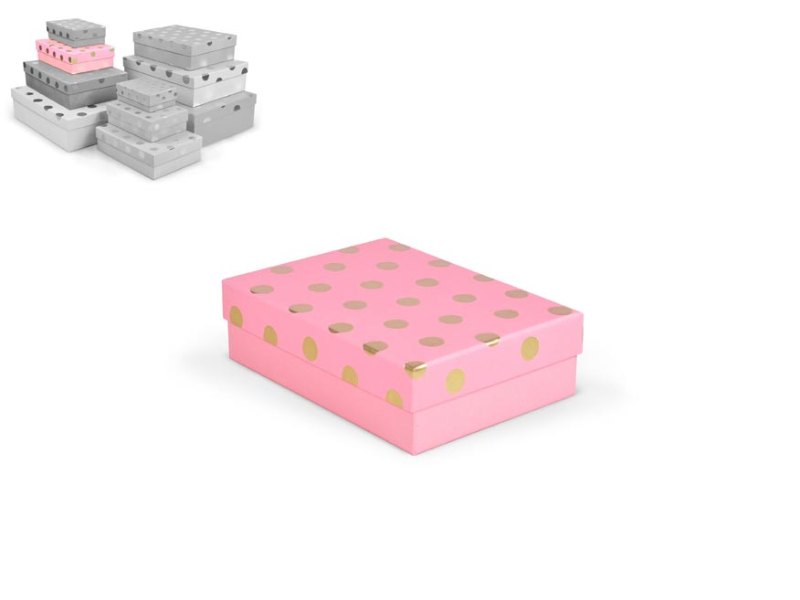 Celoročná darčeková krabička s rozmermi 22 x 16 x 6,5 cm NÁHODNÝ MIX Darčeková krabička v kombinácii farieb so zlatými bodkami. Vhodná na slávnostné príležitosti, dekoračné účely, balenie osobných darčekov alebo na uloženie rôznych drobností. Po pridaní jednej krabičky do košíka sa automaticky pridá celá súprava, ktorá obsahuje krabičky s rôznymi vzormi a veľkosťami. Táto variabilita Vám zaručuje, že máte k dispozícii krabičky vhodné na rôzne príležitosti a typy darčekov. Krabičky sú elegantne navrhnuté a navzájom ladia svojimi farbami a vzormi, čím vytvárajú harmonickú súpravu ideálnu na každú príležitosť. Materiál: 1,5 mm kartón, potiahnutý papierom s potlačou Súprava obsahuje tieto krabice: 5371115 Darčeková krabica D-L002-A 14,5x10x5cm 5371116 Darčeková krabica D-L002-B 17x12x5,5cm 5371117 Darčeková krabica D-L002-C 19x13,5x6cm 5371118 Darčeková krabica D-L002-D 22x16x6,5cm 5371119 Darčeková krabica D-L002-E 24,5x17,5x7cm 5371120 Darčeková krabica D-L002-F 27,5x19,5x7,5cm 5371121 Darčeková krabica D-L002-G 29x21x8cm 5371122 Darčeková krabica D-L002-H 33x23,5x9cm 5371123 Darčeková krabica D-L002-I 35x25x10cm 5371124 Darčeková krabica D-L002-J 37x27x11cm Uvedená cena je za 1 ks.