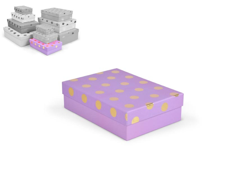 Celoročná darčeková krabička s rozmermi 24,5 x 17,5 x 7 cm NÁHODNÝ MIX Darčeková krabička v kombinácii farieb so zlatými bodkami. Vhodná na slávnostné príležitosti, dekoračné účely, balenie osobných darčekov alebo na uloženie rôznych drobností. Po pridaní jednej krabičky do košíka sa automaticky pridá celá súprava, ktorá obsahuje krabičky s rôznymi vzormi a veľkosťami. Táto variabilita Vám zaručuje, že máte k dispozícii krabičky vhodné na rôzne príležitosti a typy darčekov. Krabičky sú elegantne navrhnuté a navzájom ladia svojimi farbami a vzormi, čím vytvárajú harmonickú súpravu ideálnu na každú príležitosť. Materiál: 1,5 mm kartón, potiahnutý papierom s potlačou Súprava obsahuje tieto krabice: 5371115 Darčeková krabica D-L002-A 14,5x10x5cm 5371116 Darčeková krabica D-L002-B 17x12x5,5cm 5371117 Darčeková krabica D-L002-C 19x13,5x6cm 5371118 Darčeková krabica D-L002-D 22x16x6,5cm 5371119 Darčeková krabica D-L002-E 24,5x17,5x7cm 5371120 Darčeková krabica D-L002-F 27,5x19,5x7,5cm 5371121 Darčeková krabica D-L002-G 29x21x8cm 5371122 Darčeková krabica D-L002-H 33x23,5x9cm 5371123 Darčeková krabica D-L002-I 35x25x10cm 5371124 Darčeková krabica D-L002-J 37x27x11cm Uvedená cena je za 1 ks.