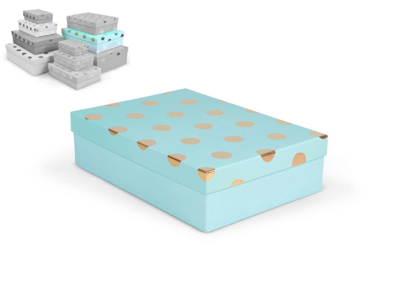 Celoročná darčeková krabička s rozmermi 33 x 23,5 x 9 cm NÁHODNÝ MIX Darčeková krabička v kombinácii farieb so zlatými bodkami. Vhodná na slávnostné príležitosti, dekoratívne účely, balenie osobných darčekov alebo na uloženie rôznych drobností. Po pridaní jednej krabičky do košíka sa automaticky pridá celá súprava, ktorá obsahuje krabičky s rôznymi vzormi a veľkosťami. Táto variabilita Vám zaručuje, že máte k dispozícii krabičky vhodné na rôzne príležitosti a typy darčekov. Krabičky sú elegantne navrhnuté a navzájom ladia svojimi farbami a vzormi, čím vytvárajú harmonickú súpravu ideálnu na každú príležitosť. Materiál: 1,5 mm kartón, potiahnutý papierom s potlačou Súprava obsahuje tieto krabice: 5371115 Darčeková krabica D-L002-A 14,5x10x5cm 5371116 Darčeková krabica D-L002-B 17x12x5,5cm 5371117 Darčeková krabica D-L002-C 19x13,5x6cm 5371118 Darčeková krabica D-L002-D 22x16x6,5cm 5371119 Darčeková krabica D-L002-E 24,5x17,5x7cm 5371120 Darčeková krabica D-L002-F 27,5x19,5x7,5cm 5371121 Darčeková krabica D-L002-G 29x21x8cm 5371122 Darčeková krabica D-L002-H 33x23,5x9cm 5371123 Darčeková krabica D-L002-I 35x25x10cm 5371124 Darčeková krabica D-L002-J 37x27x11cm Uvedená cena je za 1 ks.