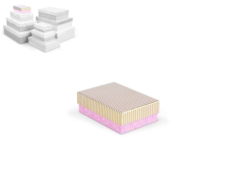 Celoročná darčeková krabička s rozmermi 17 x 12 x 5,5 cm NÁHODNÝ MIX Darčeková krabička v kombinácii pastelových farieb s rôznymi vzormi, ako sú bodky, prúžky alebo štruktúrovaný povrch. Vzory a farby sú zladené tak, aby vytvárali harmonický a elegantný vzhľad. Vhodná na slávnostné príležitosti, dekoratívne účely, balenie osobných darčekov alebo na uloženie rôznych drobností. Po pridaní jednej krabičky do košíka sa automaticky pridá celá súprava, ktorá obsahuje krabičky s rôznymi vzormi a veľkosťami. Táto variabilita Vám zaručuje, že máte k dispozícii krabičky vhodné na rôzne príležitosti a typy darčekov. Krabičky sú elegantne navrhnuté a navzájom ladia svojimi farbami a vzormi, čím vytvárajú harmonickú súpravu ideálnu na každú príležitosť. Materiál: 1,5 mm kartón, potiahnutý papierom s potlačou Súprava obsahuje tieto krabice: 5371135 Darčeková krabica D-L004-A 14,5x10x5cm 5371136 Darčeková krabica D-L004-B 17x12x5,5cm 5371137 Darčeková krabica D-L004-C 19x13,5x6cm 5371138 Darčeková krabica D-L004-D 22x16x6,5cm 5371139 Darčeková krabica D-L004-E 24,5x17,5x7cm 5371140 Darčeková krabica D-L004-F 27,5x19,5x7,5cm 5371141 Darčeková krabica D-L004-G 29x21x8cm 5371142 Darčeková krabica D-L004-H 33x23,5x9cm 5371143 Darčeková krabica D-L004-I 35x25x10cm 5371144 Darčeková krabica D-L004-J 37x27x11cm Uvedená cena je za 1 ks.
