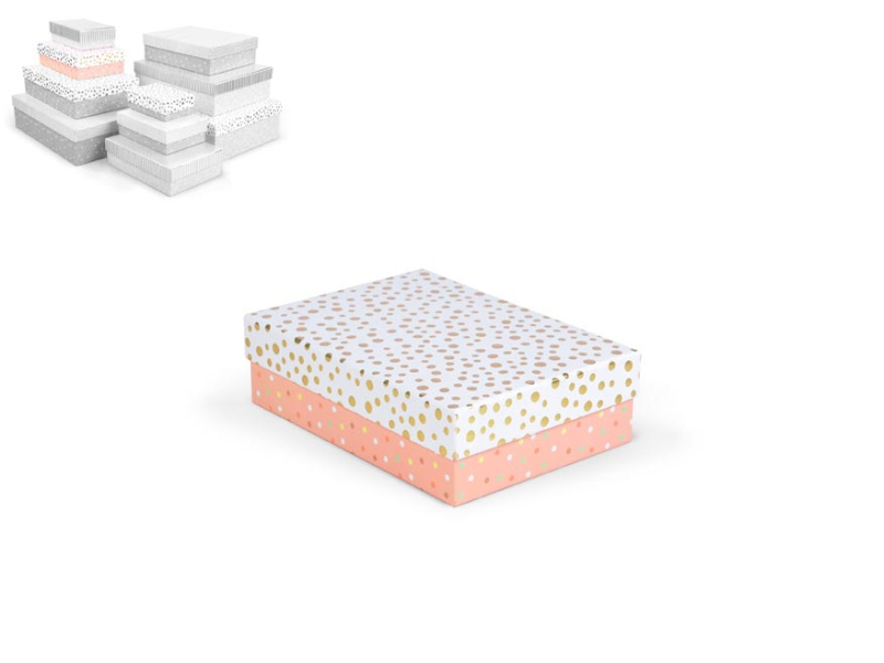 Celoročná darčeková krabička s rozmermi 22 x 16 x 6,5 cm NÁHODNÝ MIX Darčeková krabička v kombinácii pastelových farieb s rôznymi vzormi, ako sú bodky, prúžky alebo štruktúrovaný povrch. Vzory a farby sú zladené tak, aby vytvárali harmonický a elegantný vzhľad. Vhodná na slávnostné príležitosti, dekoratívne účely, balenie osobných darčekov alebo na uloženie rôznych drobností. Po pridaní jednej krabičky do košíka sa automaticky pridá celá súprava, ktorá obsahuje krabičky s rôznymi vzormi a veľkosťami. Táto variabilita Vám zaručuje, že máte k dispozícii krabičky vhodné na rôzne príležitosti a typy darčekov. Krabičky sú elegantne navrhnuté a navzájom ladia svojimi farbami a vzormi, čím vytvárajú harmonickú súpravu ideálnu na každú príležitosť. Materiál: 1,5 mm kartón, potiahnutý papierom s potlačou Súprava obsahuje tieto krabice: 5371135 Darčeková krabica D-L004-A 14,5x10x5cm 5371136 Darčeková krabica D-L004-B 17x12x5,5cm 5371137 Darčeková krabica D-L004-C 19x13,5x6cm 5371138 Darčeková krabica D-L004-D 22x16x6,5cm 5371139 Darčeková krabica D-L004-E 24,5x17,5x7cm 5371140 Darčeková krabica D-L004-F 27,5x19,5x7,5cm 5371141 Darčeková krabica D-L004-G 29x21x8cm 5371142 Darčeková krabica D-L004-H 33x23,5x9cm 5371143 Darčeková krabica D-L004-I 35x25x10cm 5371144 Darčeková krabica D-L004-J 37x27x11cm Uvedená cena je za 1 ks.