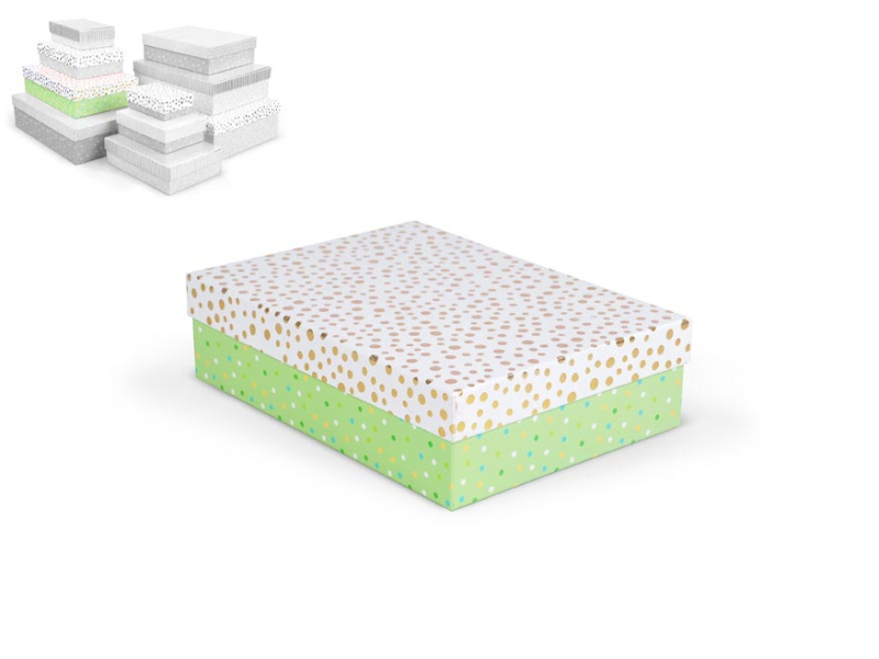 Celoročná darčeková krabička s rozmermi 29 x 21 x 8 cm NÁHODNÝ MIX Darčeková krabička v kombinácii pastelových farieb s rôznymi vzormi, ako sú bodky, prúžky alebo štruktúrovaný povrch. Vzory a farby sú zladené tak, aby vytvárali harmonický a elegantný vzhľad. Vhodná na slávnostné príležitosti, dekoratívne účely, balenie osobných darčekov alebo na uloženie rôznych drobností. Po pridaní jednej krabičky do košíka sa automaticky pridá celá súprava, ktorá obsahuje krabičky s rôznymi vzormi a veľkosťami. Táto variabilita Vám zaručuje, že máte k dispozícii krabičky vhodné na rôzne príležitosti a typy darčekov. Krabičky sú elegantne navrhnuté a navzájom ladia svojimi farbami a vzormi, čím vytvárajú harmonickú súpravu ideálnu na každú príležitosť. Materiál: 1,5 mm kartón, potiahnutý papierom s potlačou Súprava obsahuje tieto krabice: 5371135 Darčeková krabica D-L004-A 14,5x10x5cm 5371136 Darčeková krabica D-L004-B 17x12x5,5cm 5371137 Darčeková krabica D-L004-C 19x13,5x6cm 5371138 Darčeková krabica D-L004-D 22x16x6,5cm 5371139 Darčeková krabica D-L004-E 24,5x17,5x7cm 5371140 Darčeková krabica D-L004-F 27,5x19,5x7,5cm 5371141 Darčeková krabica D-L004-G 29x21x8cm 5371142 Darčeková krabica D-L004-H 33x23,5x9cm 5371143 Darčeková krabica D-L004-I 35x25x10cm 5371144 Darčeková krabica D-L004-J 37x27x11cm Uvedená cena je za 1 ks.