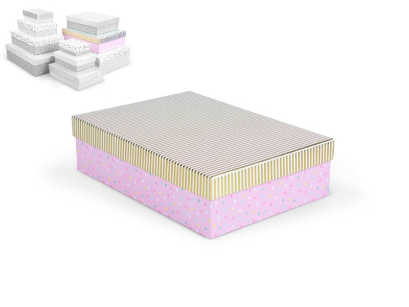 Celoročná darčeková krabička s rozmermi 33 x 23,5 x 9 cm NÁHODNÝ MIX Darčeková krabička v kombinácii pastelových farieb s rôznymi vzormi, ako sú bodky, prúžky alebo štruktúrovaný povrch. Vzory a farby sú zladené tak, aby vytvárali harmonický a elegantný vzhľad. Vhodná na slávnostné príležitosti, dekoratívne účely, balenie osobných darčekov alebo na uloženie rôznych drobností. Po pridaní jednej krabičky do košíka sa automaticky pridá celá súprava, ktorá obsahuje krabičky s rôznymi vzormi a veľkosťami. Táto variabilita Vám zaručuje, že máte k dispozícii krabičky vhodné na rôzne príležitosti a typy darčekov. Krabičky sú elegantne navrhnuté a navzájom ladia svojimi farbami a vzormi, čím vytvárajú harmonickú súpravu ideálnu na každú príležitosť. Materiál: 1,5 mm kartón, potiahnutý papierom s potlačou Súprava obsahuje tieto krabice: 5371135 Darčeková krabica D-L004-A 14,5x10x5cm 5371136 Darčeková krabica D-L004-B 17x12x5,5cm 5371137 Darčeková krabica D-L004-C 19x13,5x6cm 5371138 Darčeková krabica D-L004-D 22x16x6,5cm 5371139 Darčeková krabica D-L004-E 24,5x17,5x7cm 5371140 Darčeková krabica D-L004-F 27,5x19,5x7,5cm 5371141 Darčeková krabica D-L004-G 29x21x8cm 5371142 Darčeková krabica D-L004-H 33x23,5x9cm 5371143 Darčeková krabica D-L004-I 35x25x10cm 5371144 Darčeková krabica D-L004-J 37x27x11cm Uvedená cena je za 1 ks.