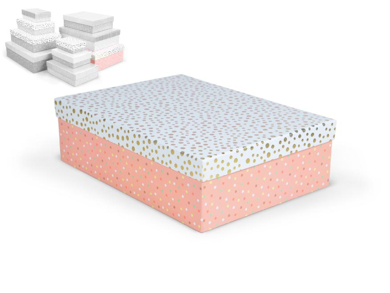 Celoročná darčeková krabička s rozmermi 37 x 27 x 11 cm NÁHODNÝ MIX Darčeková krabička v kombinácii pastelových farieb s rôznymi vzormi, ako sú bodky, prúžky alebo štruktúrovaný povrch. Vzory a farby sú zladené tak, aby vytvárali harmonický a elegantný vzhľad. Vhodná na slávnostné príležitosti, dekoratívne účely, balenie osobných darčekov alebo na uloženie rôznych drobností. Po pridaní jednej krabičky do košíka sa automaticky pridá celá súprava, ktorá obsahuje krabičky s rôznymi vzormi a veľkosťami. Táto variabilita Vám zaručuje, že máte k dispozícii krabičky vhodné na rôzne príležitosti a typy darčekov. Krabičky sú elegantne navrhnuté a navzájom ladia svojimi farbami a vzormi, čím vytvárajú harmonickú súpravu ideálnu na každú príležitosť. Materiál: 1,5 mm kartón, potiahnutý papierom s potlačou Súprava obsahuje tieto krabice: 5371135 Darčeková krabica D-L004-A 14,5x10x5cm 5371136 Darčeková krabica D-L004-B 17x12x5,5cm 5371137 Darčeková krabica D-L004-C 19x13,5x6cm 5371138 Darčeková krabica D-L004-D 22x16x6,5cm 5371139 Darčeková krabica D-L004-E 24,5x17,5x7cm 5371140 Darčeková krabica D-L004-F 27,5x19,5x7,5cm 5371141 Darčeková krabica D-L004-G 29x21x8cm 5371142 Darčeková krabica D-L004-H 33x23,5x9cm 5371143 Darčeková krabica D-L004-I 35x25x10cm 5371144 Darčeková krabica D-L004-J 37x27x11cm Uvedená cena je za 1 ks.
