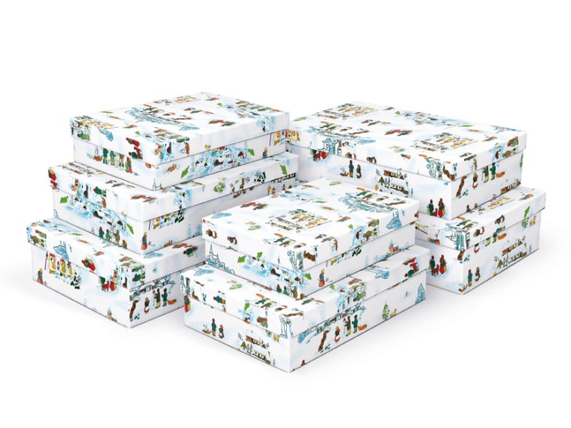 Vianočná darčeková krabička s motívmi Josefa Ladu s rozmermi 34 x 22 x 8 cm S touto krabičkou bude váš darček rýchlo a reprezentatívne zabalený. Dodávame len v súprave 7 darčekových krabíc, ktoré sú v rovnakom dizajne, ale v rôznych veľkostiach. Keď ich vložíte do košíka, ostatné škatule sa automaticky vložia, aby ste mali v košíku vždy celú, kompletnú sadu. Cena je uvedená za 1 ks. Materiál: 1,5 mm kartón potiahnutý luxusným papierom Súprava obsahuje tieto krabice: 5370755 Darčeková krabička A-V005-AL 24x16x6 cm 5370756 Darčeková krabička A-V005-BL 26x17x6 cm 5370757 Darčeková krabička A-V005-CL 28x18x7 cm 5370758 Darčeková krabička A-V005-DL 30x19x7 cm 5370759 Darčeková krabička A-V005-EL 32x20x8 cm 5370760 Darčeková krabička A-V005-FL 34x22x8 cm 5370761 Darčeková krabička A-V005-GL 36x22x9 cm