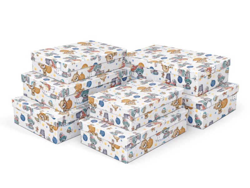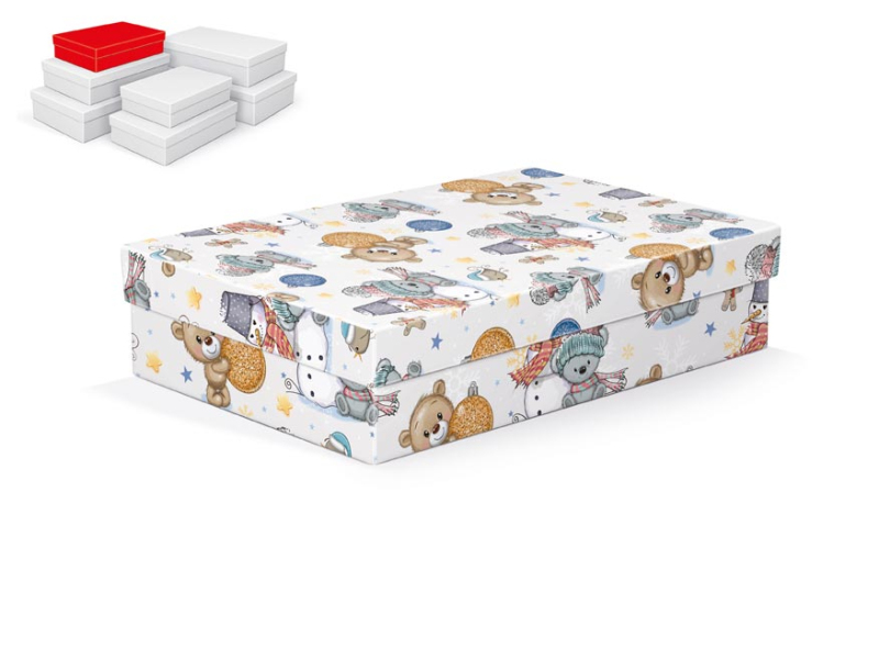 Vianočná darčeková krabička s rozmermi 26 x 17 x 6 cm Darčeková krabička s detským motívom medvedíkov, vianočných ozdôb a snehuliakov. Dodávame len v sade 7 darčekových krabíc, ktoré sú v rovnakom dizajne, ale v rôznych veľkostiach. Keď ich vložíte do košíka, ostatné škatule sa automaticky vložia, aby ste mali v košíku vždy celú, kompletnú sadu. Cena je uvedená za 1 ks. Materiál: 1,5 mm kartón, potiahnutý papierom s potlačou Súprava obsahuje tieto krabice: 5371023 Vianočná darčeková krabička A-V010-A 24x16x6 cm 5371024 Vianočná darčeková krabička A-V010-B 26x17x6 cm 5371025 Vianočná darčeková krabička A-V010-C 28x18x7 cm 5371026 Vianočná darčeková krabička A-V010-D 30x19x7 cm 5371027 Vianočná darčeková krabička A-V010-E 32x20x8 cm 5371028 Vianočná darčeková krabička A-V010-F 34x22x8 cm 5371029 Vianočná darčeková krabička A-V010-G 36x22x9 cm