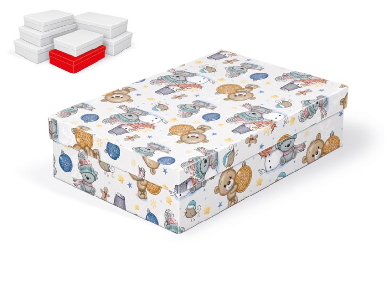 Vianočná darčeková krabička, rozmery 28 x 18 x 7 cm Darčeková krabička s detským motívom medvedíkov, vianočných ozdôb a snehuliakov. Dodávame len v sade 7 darčekových krabíc, ktoré sú v rovnakom dizajne, ale v rôznych veľkostiach. Keď ich vložíte do košíka, ostatné škatule sa automaticky vložia, aby ste mali v košíku vždy celú, kompletnú sadu. Cena je uvedená za 1 ks. Materiál: 1,5 mm kartón, potiahnutý papierom s potlačou Súprava obsahuje tieto krabice: 5371023 Vianočná darčeková krabička A-V010-A 24x16x6 cm 5371024 Vianočná darčeková krabička A-V010-B 26x17x6 cm 5371025 Vianočná darčeková krabička A-V010-C 28x18x7 cm 5371026 Vianočná darčeková krabička A-V010-D 30x19x7 cm 5371027 Vianočná darčeková krabička A-V010-E 32x20x8 cm 5371028 Vianočná darčeková krabička A-V010-F 34x22x8 cm 5371029 Vianočná darčeková krabička A-V010-G 36x22x9 cm