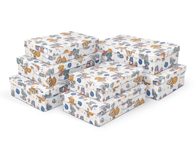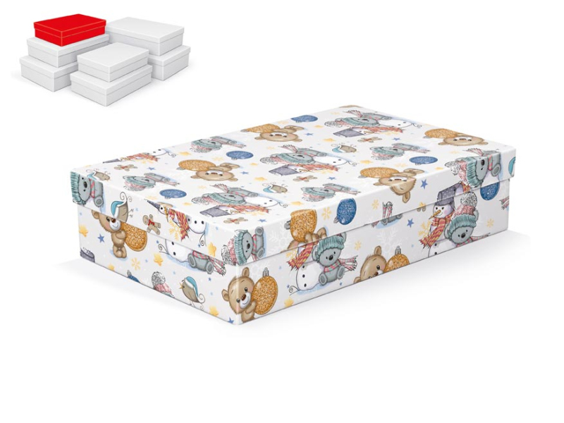 Vianočná darčeková krabička s rozmermi 30 x 19 x 7 cm Darčeková krabička s detským motívom medvedíkov, vianočných ozdôb a snehuliakov. Dodávame len v sade 7 darčekových krabíc, ktoré sú v rovnakom dizajne, ale v rôznych veľkostiach. Keď ich vložíte do košíka, ostatné škatule sa automaticky vložia, aby ste mali v košíku vždy celú, kompletnú sadu. Cena je uvedená za 1 ks. Materiál: 1,5 mm kartón, potiahnutý papierom s potlačou Súprava obsahuje tieto krabice: 5371023 Vianočná darčeková krabička A-V010-A 24x16x6 cm 5371024 Vianočná darčeková krabička A-V010-B 26x17x6 cm 5371025 Vianočná darčeková krabička A-V010-C 28x18x7 cm 5371026 Vianočná darčeková krabička A-V010-D 30x19x7 cm 5371027 Vianočná darčeková krabička A-V010-E 32x20x8 cm 5371028 Vianočná darčeková krabička A-V010-F 34x22x8 cm 5371029 Vianočná darčeková krabička A-V010-G 36x22x9 cm