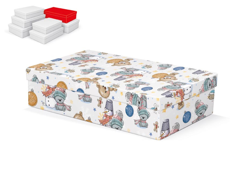 Vianočná darčeková krabička s rozmermi 32 x 20 x 8 cm Darčeková krabička s detským motívom medvedíkov, vianočných ozdôb a snehuliakov. Dodávame len v sade 7 darčekových krabíc, ktoré sú v rovnakom dizajne, ale v rôznych veľkostiach. Keď ich vložíte do košíka, ostatné škatule sa automaticky vložia, aby ste mali v košíku vždy celú, kompletnú sadu. Cena je uvedená za 1 ks. Materiál: 1,5 mm kartón, potiahnutý papierom s potlačou Súprava obsahuje tieto krabice: 5371023 Vianočná darčeková krabička A-V010-A 24x16x6 cm 5371024 Vianočná darčeková krabička A-V010-B 26x17x6 cm 5371025 Vianočná darčeková krabička A-V010-C 28x18x7 cm 5371026 Vianočná darčeková krabička A-V010-D 30x19x7 cm 5371027 Vianočná darčeková krabička A-V010-E 32x20x8 cm 5371028 Vianočná darčeková krabička A-V010-F 34x22x8 cm 5371029 Vianočná darčeková krabička A-V010-G 36x22x9 cm