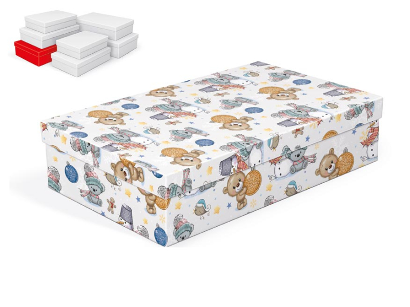 Vianočná darčeková krabička s rozmermi 34 x 22 x 8 cm Darčeková krabička s detským motívom medvedíkov, vianočných ozdôb a snehuliakov. Dodávame len v sade 7 darčekových krabíc, ktoré sú v rovnakom dizajne, ale v rôznych veľkostiach. Keď ich vložíte do košíka, ostatné škatule sa automaticky vložia, aby ste mali v košíku vždy celú, kompletnú sadu. Cena je uvedená za 1 ks. Materiál: 1,5 mm kartón, potiahnutý papierom s potlačou Súprava obsahuje tieto krabice: 5371023 Vianočná darčeková krabička A-V010-A 24x16x6 cm 5371024 Vianočná darčeková krabička A-V010-B 26x17x6 cm 5371025 Vianočná darčeková krabička A-V010-C 28x18x7 cm 5371026 Vianočná darčeková krabička A-V010-D 30x19x7 cm 5371027 Vianočná darčeková krabička A-V010-E 32x20x8 cm 5371028 Vianočná darčeková krabička A-V010-F 34x22x8 cm 5371029 Vianočná darčeková krabička A-V010-G 36x22x9 cm