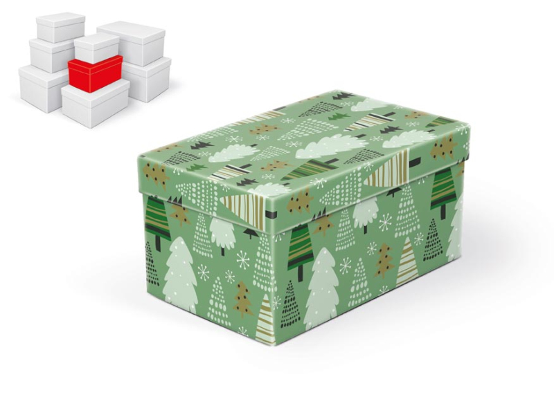 Vianočná darčeková krabička s rozmermi 20 x 12 x 10 cm Darčeková krabička s motívom vianočných stromčekov a vločiek. Dodávame len v súprave 8 darčekových krabíc, ktoré sú v rovnakom dizajne, ale v rôznych veľkostiach. Pri vložení do košíka sa automaticky vložia aj ostatné krabice tak, aby ste mali v košíku vždy celú, kompletnú súpravu. Uvedená cena jeza 1 ks. Materiál:1,5 mm kartón potiahnutý luxusným papierom Súprava obsahuje tieto krabice: 5370915 Krabica darčeková vianočná B-V006-A 16x10x8 cm 5370916 Krabica darčeková vianočná B-V006-B 18x11x9 cm 5370917 Krabica darčeková vianočná B-V006-C 20x12x10 cm 5370918 Krabica darčeková vianočná B-V006-D 22x14x11 cm 5370919 Krabica darčeková vianočná B-V006-E 24x16x12 cm 5370920 Krabica darčeková vianočná B-V006-F 26x17x13 cm 5370921 Krabica darčeková vianočná B-V006-G 28x18x14 cm 5370922 Krabica darčeková vianočná B-V006-H 30x19x15 cm