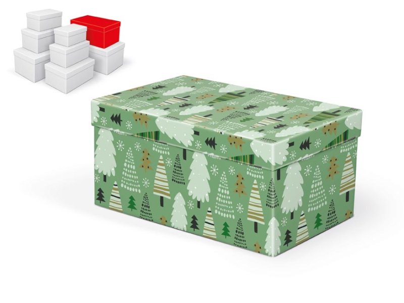 Vianočná darčeková krabička s rozmermi 26 x 17 x 13 cm Darčeková krabička s motívom vianočných stromčekov a vločiek.Dodávame len v súprave 8 darčekových krabičiek v rovnakom dizajne, ale v rôznych veľkostiach. Pri vožení do košíka sa automaticky vložia aj ostatné krabice tak, aby ste mali v košíku vždy celý, komletný súbor. Uvedená cena je za 1 ks. Mteriál: 1,5 mm kartón, potiahnutý luxusným papierom Súprava obsahuje tieto krabice: 5370915 Krabica darčeková vianočná B-V006-A 16x10x8 cm 5370916 Krabica darčeková vianočná B-V006-B 18x11x9 cm 5370917 Krabica darčeková vianočná B-V006-C 20x12x10 cm 5370918 Krabica darčeková vianočná B-V006-D 22x14x11 cm 5370919 Krabica darčeková vianočná B-V006-E 24x16x12 cm 5370920 Krabica darčeková vianočná B-V006-F 26x17x13 cm 5370921 Krabica darčeková vianočná B-V006-G 28x18x14 cm 5370922 Krabica darčeková vianočná B-V006-H 30x19x15 cm