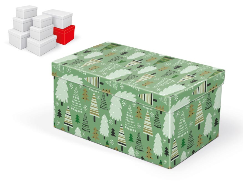 Vianočná darčeková krabička s rozmermi 30 x 19 x 15 cm Darčeková krabička s motívom vianočných stromčekov a vločiek. Dodávame len v súprave 8 darčekových krabičiek, ktoré sú v rovnakom dizajne ale vrôznych veľkostiach. Pri vložení do košíka sa automaticky vložia aj ostatné krabice, tak aby ste mali v košíu vždy celú kompletnú súpravu. Uvedená cena je za 1 ks. Materiál: 1,5 mm kartón potiahnutý luxusným papierom Súprava obsahuje tieto krabice: 5370915 Krabica darčeková vianočná B-V006-A 16x10x8 cm 5370916 Krabica darčeková vianočná B-V006-B 18x11x9 cm 5370917 Krabica darčeková vianočná B-V006-C 20x12x10 cm 5370918 Krabica darčeková vianočná B-V006-D 22x14x11 cm 5370919 Krabica darčeková vianočná B-V006-E 24x16x12 cm 5370920 Krabica darčeková vianočná B-V006-F 26x17x13 cm 5370921 Krabica darčeková vianočná B-V006-G 28x18x14 cm 5370922 Krabica darčeková vianočná B-V006-H 30x19x15 cm