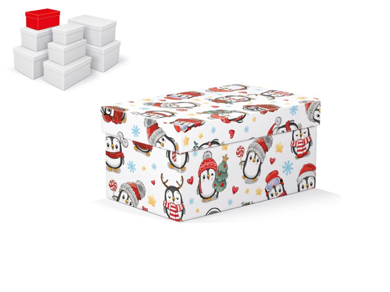 Vianočná darčeková krabička s rozmermi 18 x 11 x 9 cm Darčeková krabička s detským, vianočným motívom tučniakov. Dodávame iba v sete 8 darčekových krabičiek, ktoré sú v rovnakom dizajne, ale rôznych veľkostiach. Pri vložení do košíka sa automaticky vložia aj ostatné krabičky, tak aby ste mali v košíku vždy celý, kompletný set. Cena je uvedená za 1 ks. Materiál: 1,5 mm kartón, potiahnutý papierom s potlačou Sada obsahuje tieto krabice: 5371038 Darčeková krabička B-V009-A 16x10x8 cm 5371039 Darčeková krabička B-V009-B 18x11x9 cm 5371040 Darčeková krabička B-V009-C 20x12x10 cm 5371041 Darčeková krabička B-V009-D 22x14x11 cm 5371042 Darčeková krabička B-V009-E 24x16x12 cm 5371043 Darčeková krabička B-V009-F 26x17x13 cm 5371044 Darčeková krabička B-V009-G 28x18x14 cm 5371045 Darčeková krabička B-V009-H 30x19x15 cm