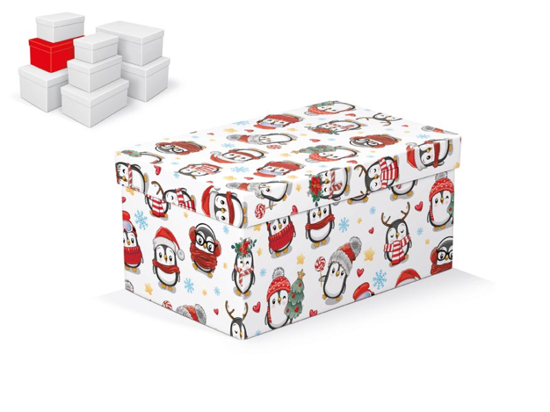 Vianočná darčeková krabička s rozmermi 22 x 14 x 11 cm Darčeková krabička s detským, vianočným motívom tučniakov. Dodávame iba v sete 8 darčekových krabičiek, ktoré sú v rovnakom dizajne, ale rôznych veľkostiach. Pri vložení do košíka sa automaticky vložia aj ostatné krabičky, tak aby ste mali v košíku vždy celý, kompletný set. Cena je uvedená za 1 ks. Materiál: 1,5 mm kartón, potiahnutý papierom s potlačou Súprava obsahuje tieto krabice: 5371038 Darčeková krabička B-V009-A 16x10x8 cm 5371039 Darčeková krabička B-V009-B 18x11x9 cm 5371040 Darčeková krabička B-V009-C 20x12x10 cm 5371041 Darčeková krabička B-V009-D 22x14x11 cm 5371042 Darčeková krabička B-V009-E 24x16x12 cm 5371043 Darčeková krabička B-V009-F 26x17x13 cm 5371044 Darčeková krabička B-V009-G 28x18x14 cm 5371045 Darčeková krabička B-V009-H 30x19x15 cm