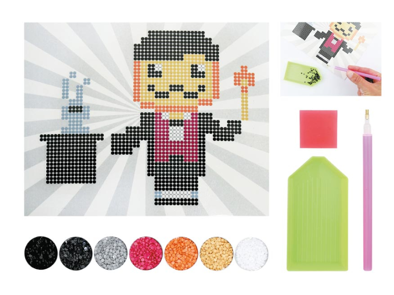 Kreatívny set – diamantová mozaika kúzelníka BALENIE OBSAHUJE: - 1 x obrázok - 1 x plastová vanička - 1 x pero - 1 x vosková podložka - 7 x farebné diamanty VAROVANIE: Nevhodné pre deti do 3 rokov. Obsahuje malé časti, hrozí nebezpečenstvo udusenia. Uvedená cena je za 1 balenie.