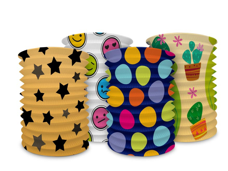 Papierový valcovitý lampión farebný s obrázkami. Vhodná dekorácia na party, do lampiónového sprievodu, záhradnú slávnosť, karneval, oslavu narodenín, alebo len tak na zavesenie do detskej izbičky. Vyberte si svoj lampión a urobte si z bežného večera čarovný. Lampión je bez paličky a svetielka. Lampión má pútko na zavesenie. Materiál: papier, kov Polomer lampiónov: 15 cm Motívy: hviezdičky, kolieska, kaktusy, smajlíky Dodávame v mixe po 4 ks podľa skladových zásob. Uvedená cena je za 1 ks.