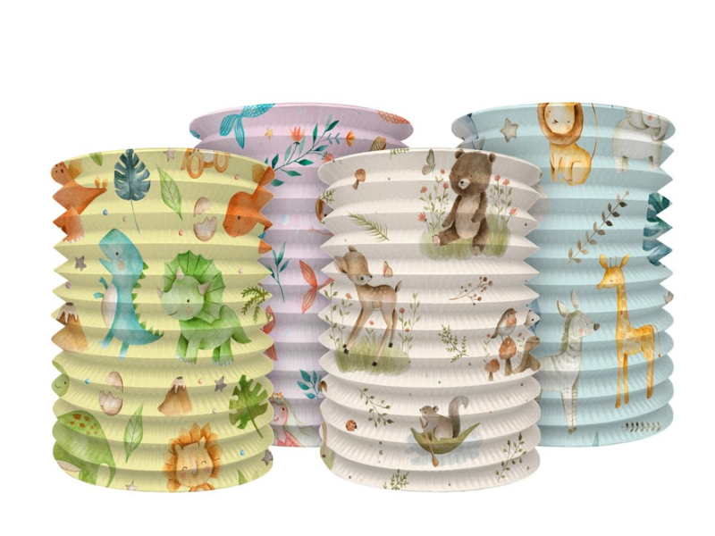 Papierový valcovitý lampión s detskými motívmi, v kombinácii farieb. Vhodný ako dekorácia na párty, lampiónový sprievod, záhradnú slávnosť, karneval, narodeninovú oslavu alebo len tak na zavesenie v detskej izbe. Vyberte si svoj lampión a urobte z obyčajného večera čarovný. Lampión je vyrobený z nehorľavého papiera a má držiak na sviečku alebo žiarovku. Lampión je bez prútika a svetla. Lampión má pútko na zavesenie. Materiál: papier, kov Priemer lampiónu: 15 cm Farba: zelená, béžová, modrá, ružová Motívy: dinosaury, morské panny, lesné zvieratá, exotické zvieratá Dodávame v mixe 4 ks podľa skladovej zásoby. Uvedená cena je za 1 ks.
