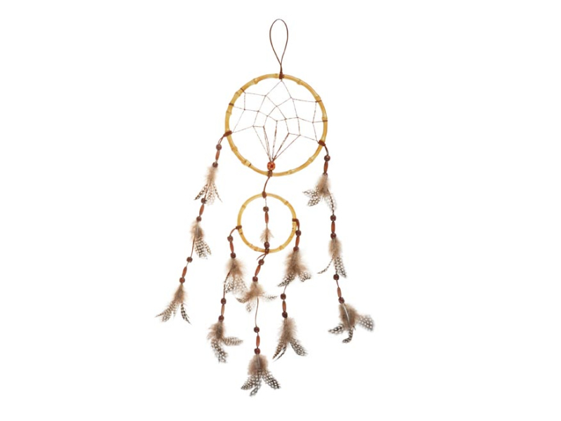 Dekorácia lapač snov v hnedej farbe. Lapač zavesíte voľne do miestnosti alebo nad posteľ, všetky nočné mory sa do neho zachytia a do rána budú razom preč. Lapač snov má dva kruhy (jeden menší a jeden väčší) a okolo nich je omotaný špagát. Z povrázku visí hnedá pierka s korálkami. Lapač má aj povrázok na zavesenie. Dodávame v sáčku so závesom. Uvedená cena je za 1 ks.