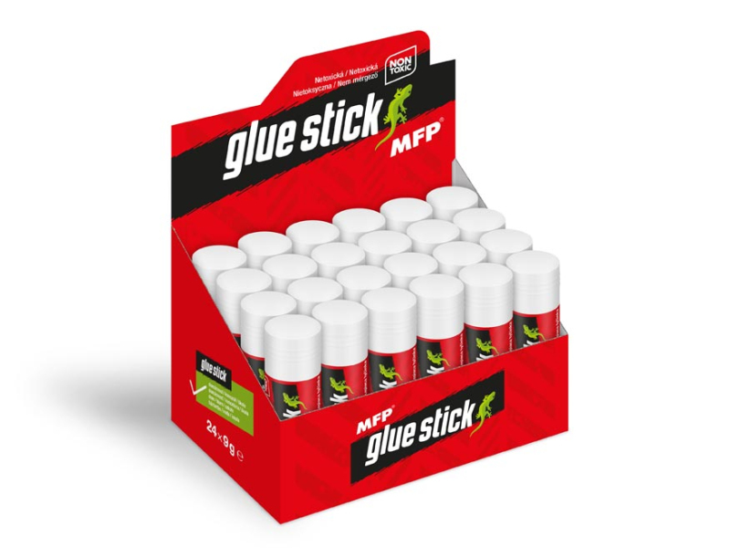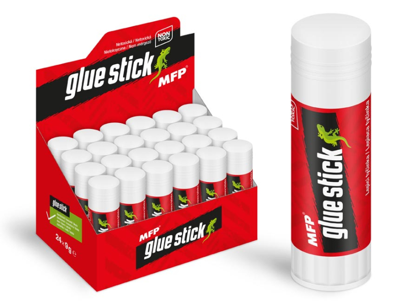 Tuhé lepidlo (lepiaca tyčinka) na papier, kartón, fotografie, korok. Univerzálne použitie v kancelárii, doma aj v škole. Lepidlo sa vysúva z plastového puzdra pootočením spodného dielu. Lepidlo je ľahko vyprateľné a umývateľné vlažnou vodou. Neobsahuje toxické a škodlivé látky. Hmotnosť: 9 g Veľkoobchodné balenie je po 24 ks v praktickej papierovej krabičke s plastovým stojanom. Uvedená cena je za 1 ks.