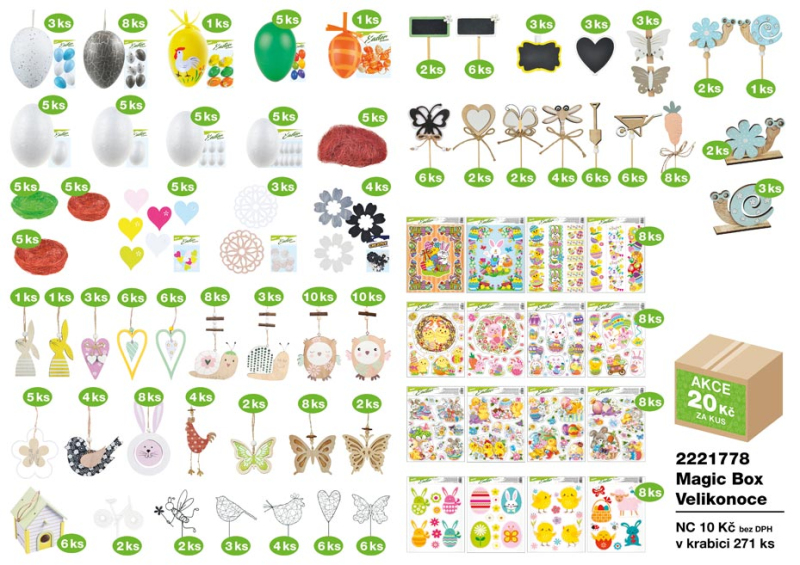 Veľkonočný Magic BOX. Box obsahuje 266 ks rôznych veľkonočných ozdôb a dekorácií. Nájdete tu napr. samolepiace okenné fólie, dekorácie na zavesenie aj postavenie, zápichy do kvetináčov, štipce, farebné plastové vajíčka, veľkonočné kuriatka alebo dekoračné hniezda a sisal. Dekorácie sú z rôznych materiálov ako je drevo, plast, papier, kov ai. Široká škála veľkonočných ozdôb zaručí, že budete mať všetko, čo potrebujete na jarnú výzdobu Vášho domova. V prípade vypredania niektorého z produktov môže byť nahradený iným. Všetko v jednotnej akčnej cene. BALENIE OBSAHUJE: - 266 ks ozdôb Všetkých 266 ks je balených v kartónovej krabici. Dodávame iba ako celok 266 ks. Uvedená cena je za 1 ks.
