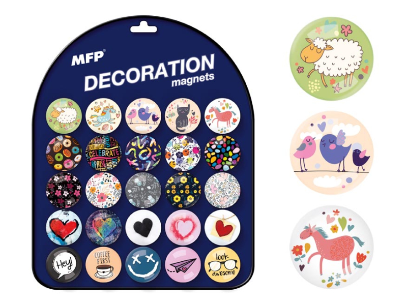 Sklenené guľaté dekoračné magnetky. Na magnetickej tabuľke je 25 rôznych dizajnov. Magnetky držia na chladničke, radiátore, práčke, alebo na inom magnetickom povrchu. Dajú sa ľahko premiestňovať. Priemer magnetky: 35 mm VAROVANIE: Nie je to hračka! Obal odstráňte z dosahu detí. Odporúčaný vek je od 3 rokov dieťaťa. Magnety vo vnútri ľudského tela môžu spôsobiť vážne zranenia! V prípade prehltnutia alebo vdýchnutia vyhľadajte okamžite lekársku pomoc! Dodávame v mixe po 25 ks podľa skladových zásob. Uvedená cena je za 1 ks.