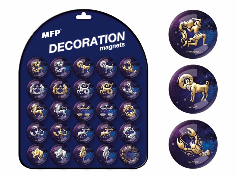 Sklenené guľaté dekoračné magnetky v motívoch horoskopov. Na magnetickej tabuli je 25 rôznych dizajnov. Magnetky držia na chladničke, radiátore, práčke alebo inom kovovom povrchu. Môžu sa ľahko premiestňovať. Priemer magnetky: 35 mm VAROVANIE: Nie je to hračka! Obal odstráňte z dosahu detí. Odporúčaný vek používania je od 3 rokov dieťaťa. Magnety vo vnútri ľudského tela môžu spôsobiť vážne zranenia! V prípade prehltnutia alebo vdýchnutia vyhľadajte okamžite lekársku pomoc! Dodávame v mixe podľa skladových zásob. Uvedená cena je za 1 ks.