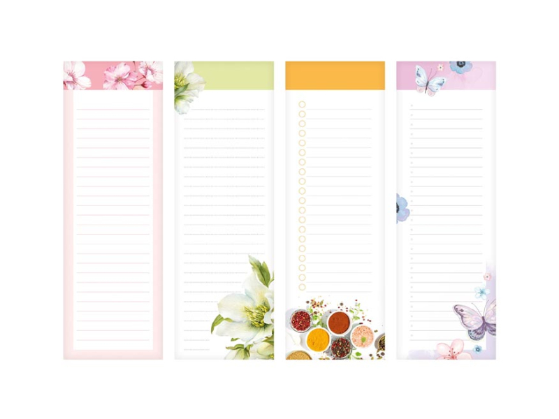 Magnetický blok na chladničku. Vďaka magnetu bude držať na všetkom kovovom a budete ho mať tak stále na očiach. Praktický trhací bloček na poznámky, nákupy ai. Počet listov: 80 Rozmer: 80 x 240 mm Dodávame v mixe 4 motívov podľa skladovej zásoby. Uvedená cena je za 1 ks.