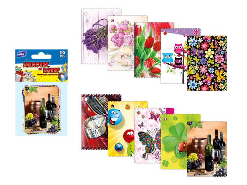 Menovky na darčeky. Každý darček nás vždy poteší, ale je treba, aby bol označený pre toho, komu patrí a na to slúžia tieto farebné menovky s rôznymi motívmi, ktoré darček spestria. BALENIE OBSAHUJE: -10 ks menoviek s celoročnými motívmi a so zvlnenými okrajmi Menovky sú balené vo vrecku so závesom. Uvedená cena je za 1 balenie 10 ks.