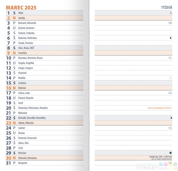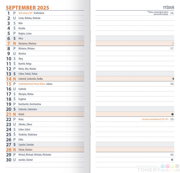 Kabelkový diár s prehľadným mesiacom na dvojstrane. V mini diári nájdete aj priestor pre písanie poznámok a pripomienok, adresár. Obsahuje slovenské mená, štátne sviatky a fázy Mesiaca.