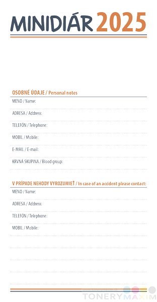 Kabelkový diár s prehľadným mesiacom na dvojstrane. V mini diári nájdete aj priestor pre písanie poznámok a pripomienok, adresár. Obsahuje slovenské mená, štátne sviatky a fázy Mesiaca.