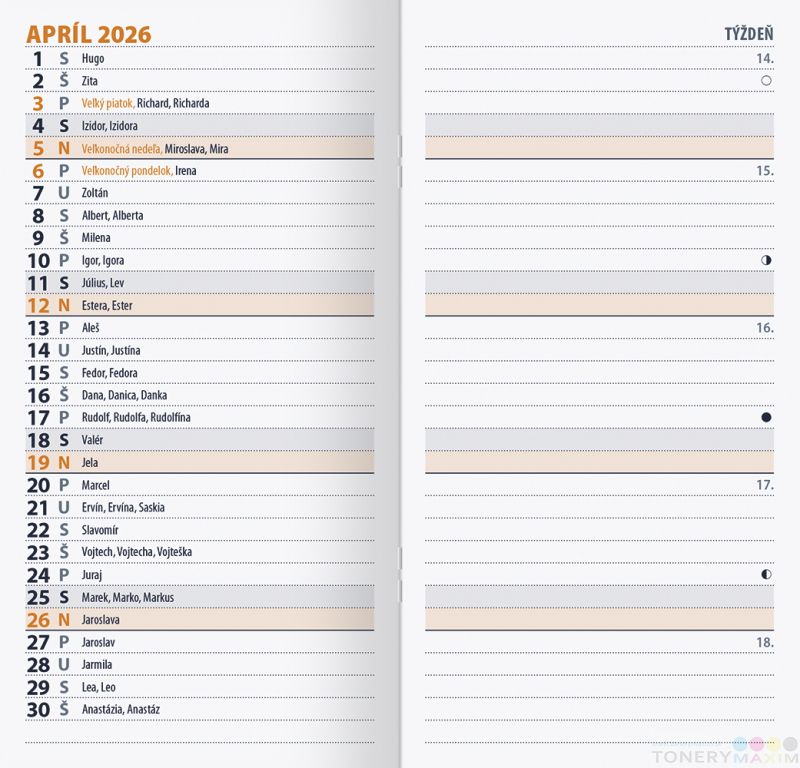 Kabelkový diár s prehľadným mesiacom na dvojstrane. V mini diári nájdete aj priestor pre písanie poznámok a pripomienok, adresár. Obsahuje slovenské mená, štátne sviatky a fázy Mesiaca.