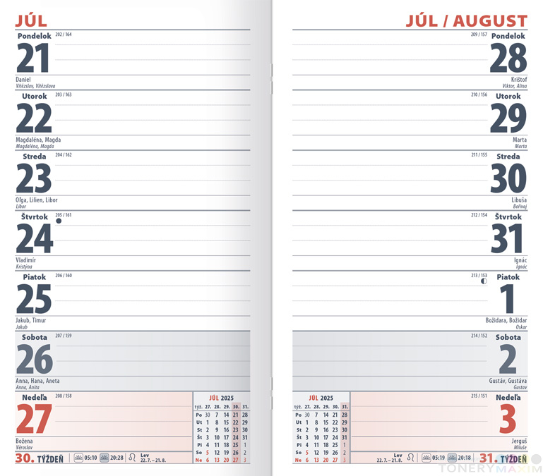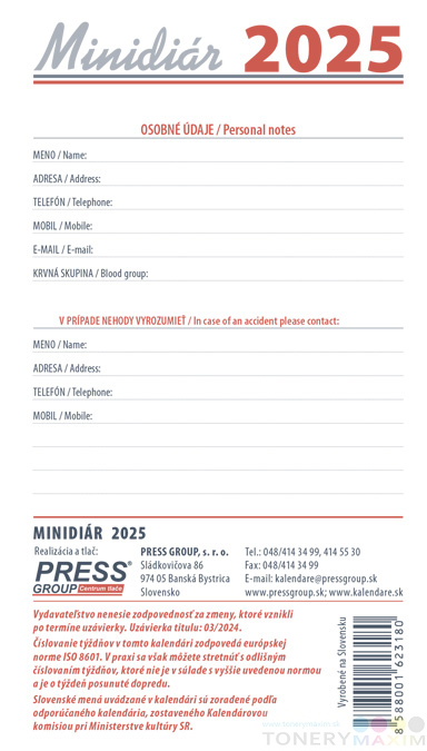 Vreckový, či kabelkový diár s prehľadným týždňom na každej strane. Obsahuje slovenské a české kalendárium, prehľadný aj plánovací kalendár, informácie o školských prázdninách. Nájdete v ňom priestor pre písanie poznámok a pripomienok, adresár či informácie o štátnych sviatkoch susediacich krajín EÚ.