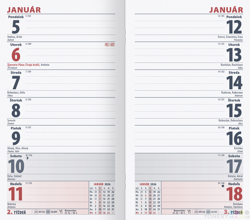 Vreckový, či kabelkový diár s prehľadným týždňom na každej strane. Obsahuje slovenské a české kalendárium, prehľadný aj plánovací kalendár, informácie o školských prázdninách. Nájdete v ňom priestor pre písanie poznámok a pripomienok, adresár či informácie o štátnych sviatkoch susediacich krajín EÚ.
