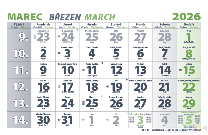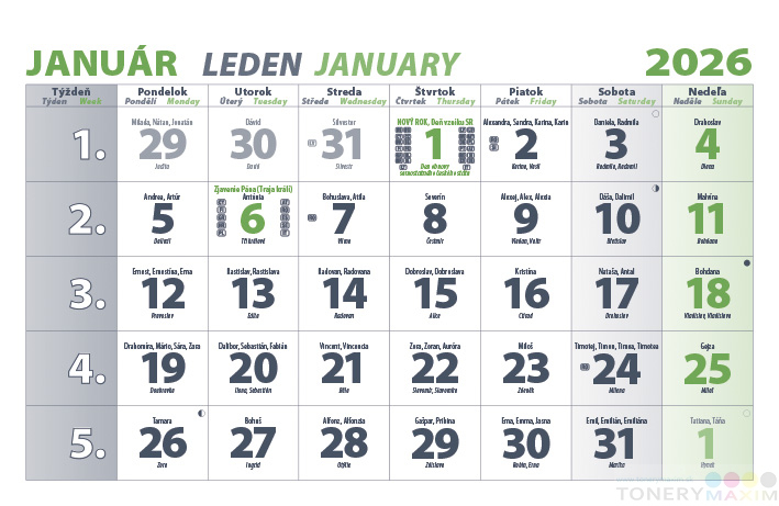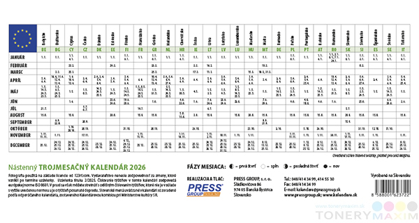 Má posuvné okienko pre lepšiu orientáciu v mesiaci, kalendárium so slovenskými a českými menami a sviatkami v krajinách EÚ. Kalendár je vhodný aj pre organizácie a spoločnosti. Ponúka možnosť umiestnenia vlastnej grafiky namiesto obrázku na vrchný lash, či potlač podložky. Na druhej strane vrchného lashu nájdete kompletný prehľad sviatkov v krajinách EÚ.