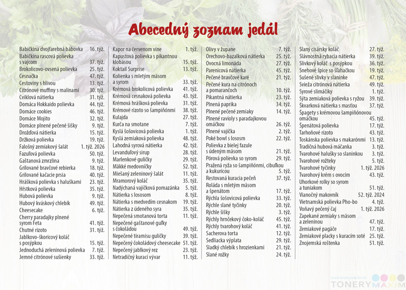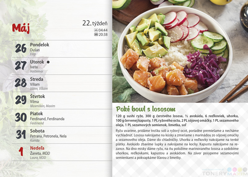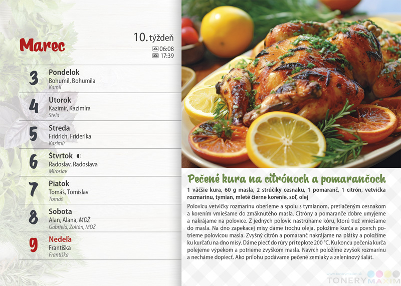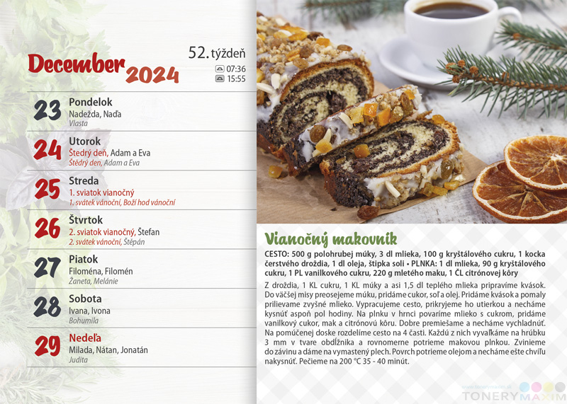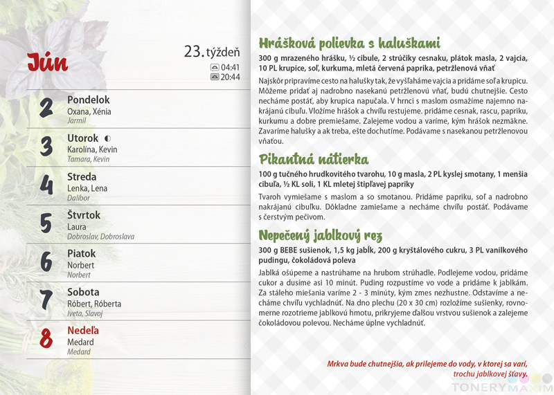 Milujete tradičnú slovenskú kuchyňu, ale radi vyskúšate aj niečo nové? Inšpirujte sa nástenným dvojtýždňovým kalendárom s obrázkami a receptami jedál a praktickými radami do kuchyne. Obsahuje slovenské a české mená, sviatky oboch krajín a fázy Mesiaca. Kalendár má dierku na zavesenie.