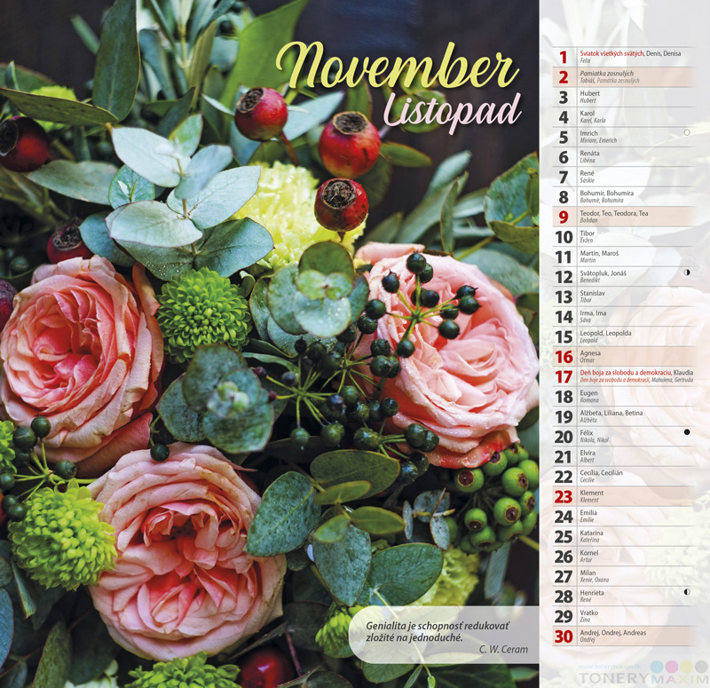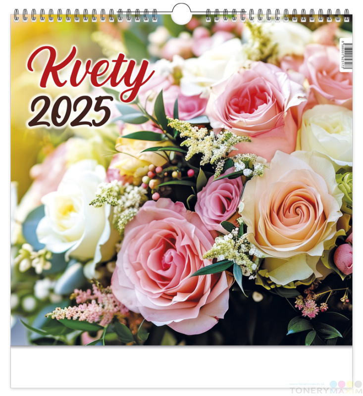 Očarujúci nástenný kalendár Kvety poteší krásou, farebnosťou a dokonalosťou kvetov. Každý mesiac prináša krátky citát na zamyslenie. Obsahuje mesačné kalendárium so slovenskými a českými menami, štátnymi sviatkami a fázami Mesiaca.