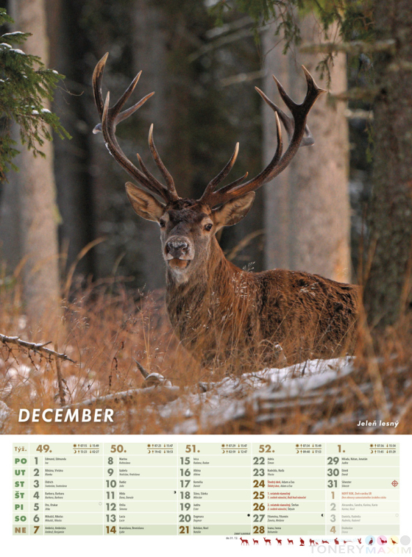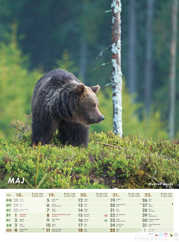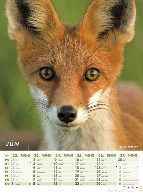 Mesačný kalendár, ktorý očarí každého milovníka prírody. Fascinujúce zábery voľne žijúcich zvierat s podrobnými informáciami o dobe lovu, fázami Mesiaca, východmi a západmi Slnka a Mesiaca. Obsahuje slovenské a české mená a štátne sviatky.