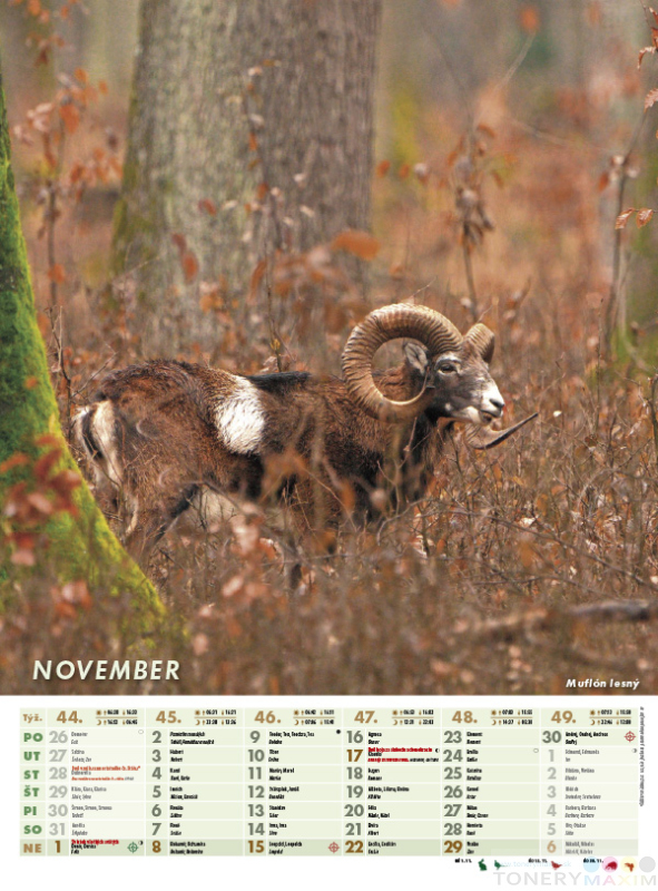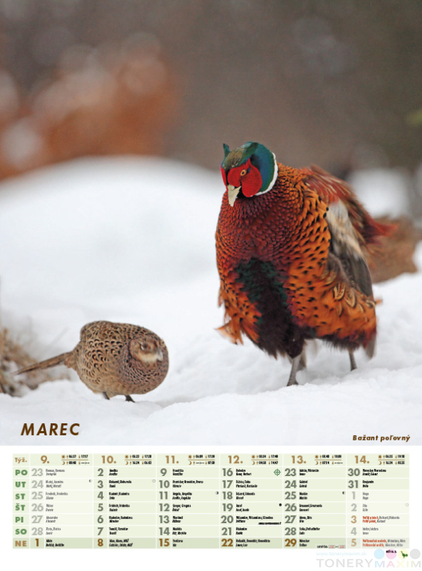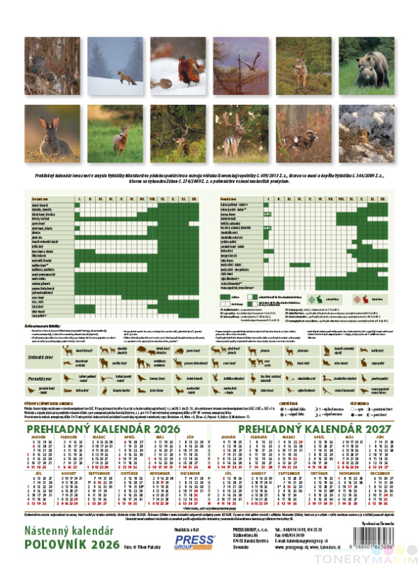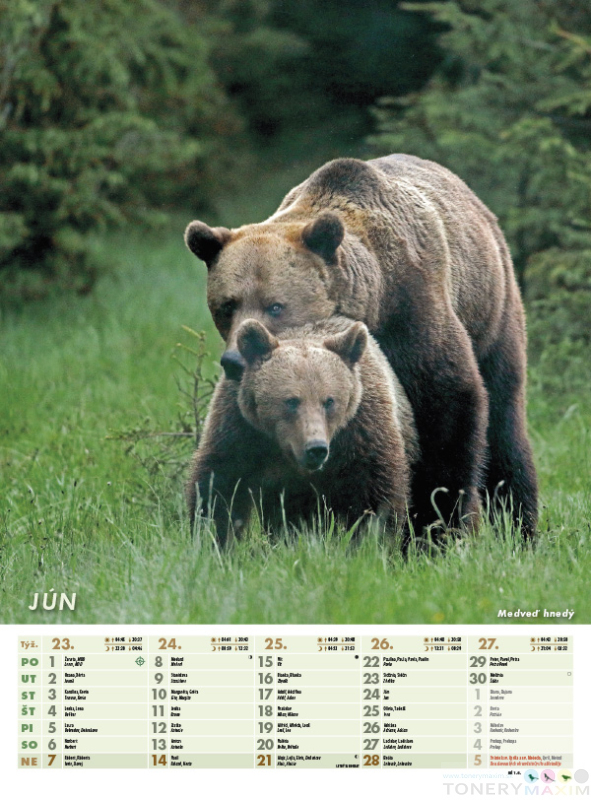 Mesačný kalendár, ktorý očarí každého milovníka prírody. Fascinujúce zábery voľne žijúcich zvierat s podrobnými informáciami o dobe lovu, fázami Mesiaca, východmi a západmi Slnka a Mesiaca. Obsahuje slovenské a české mená a štátne sviatky.