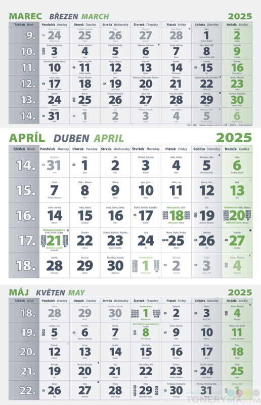 Má posuvné okienko pre lepšiu orientáciu v mesiaci, kalendárium so slovenskými a českými menami a sviatkami, a tiež sviatkami krajín EÚ. Vhodný aj pre organizácie a spoločnosti. Ponúka možnosť umiestnenia vlastnej grafiky namiesto obrázku na vrchný lash, či potlač podložky. Na druhej strane vrchného lashu nájdete kompletný prehľad sviatkov vo všetkých krajinách EÚ.