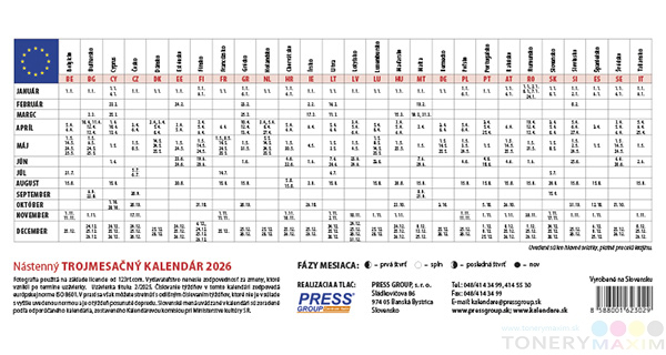 Má posuvné okienko pre lepšiu orientáciu v mesiaci, kalendárium so slovenskými a českými menami a sviatkami, a tiež sviatkami krajín EÚ. Vhodný aj pre organizácie a spoločnosti. Ponúka možnosť umiestnenia vlastnej grafiky namiesto obrázku na vrchný lash, či potlač podložky. Na druhej strane vrchného lashu nájdete kompletný prehľad sviatkov vo všetkých krajinách EÚ.