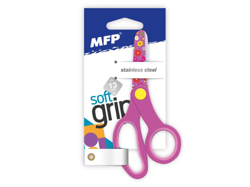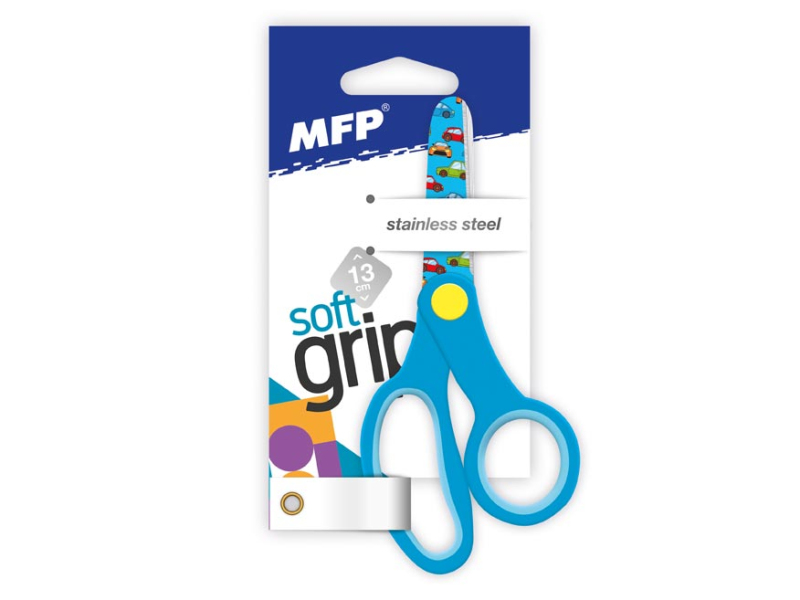 Detské nožnice s farebnou potlačou na nožoch vo veľkosti 13 cm. Nožnice majú zaoblený hrot, mäkkú ergonomickú rukoväť a sú vhodné do školy i do domácnosti. Ponúkame ich v troch vyhotoveniach: modré – autá, zelené – smajlíky, ružové – kvety. Dĺžka ostria od stredu nitovania: 50 mm VAROVANIE: Nie sú vhodné pre deti do 3 rokov. Ostré hrany! Dodávame v mixe po 3 ks podľa skladových zásob. Uvedená cena je za 1 ks.