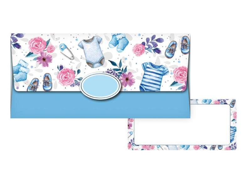 Darčeková obálka na peniaze s motívom pre bábätko (chlapčeka). Urobte novopečeným rodičom radosť a venujte im obálku s peniazmi. Vnútri je kartička bez textu, na ktorú môžete napísať venovanie. PREVEDENIE: modrá, vhodná k narodeniu bábätka (chlapčeka) Dodávame v plastom vrecku so závesom. Uvedená cena je za 1 ks.