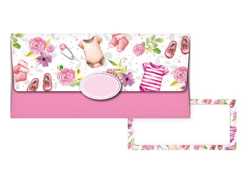 Darčeková obálka na peniaze s motívom pre bábätko (dievčatko). Urobte novopečeným rodičom radosť a venujte im obálku s peniazmi. Vnútri je kartička bez textu, na ktorú môžete napísať venovanie. PREVEDENIE: ružová, vhodná k narodeniu bábätka (dievčatka) Dodávame v plastom vrecku so závesom. Uvedená cena je za 1 ks.